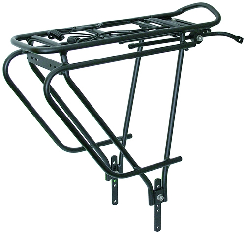 Aluminum tube rack made of 6061 T6 aluminum, with 10mm round tubing, adjustable for 24-29" wheels, particularly suitable for GPT panniers due to its lower-mounted struts, reflector and rear light mounts, load capacity up to 25 kg, black